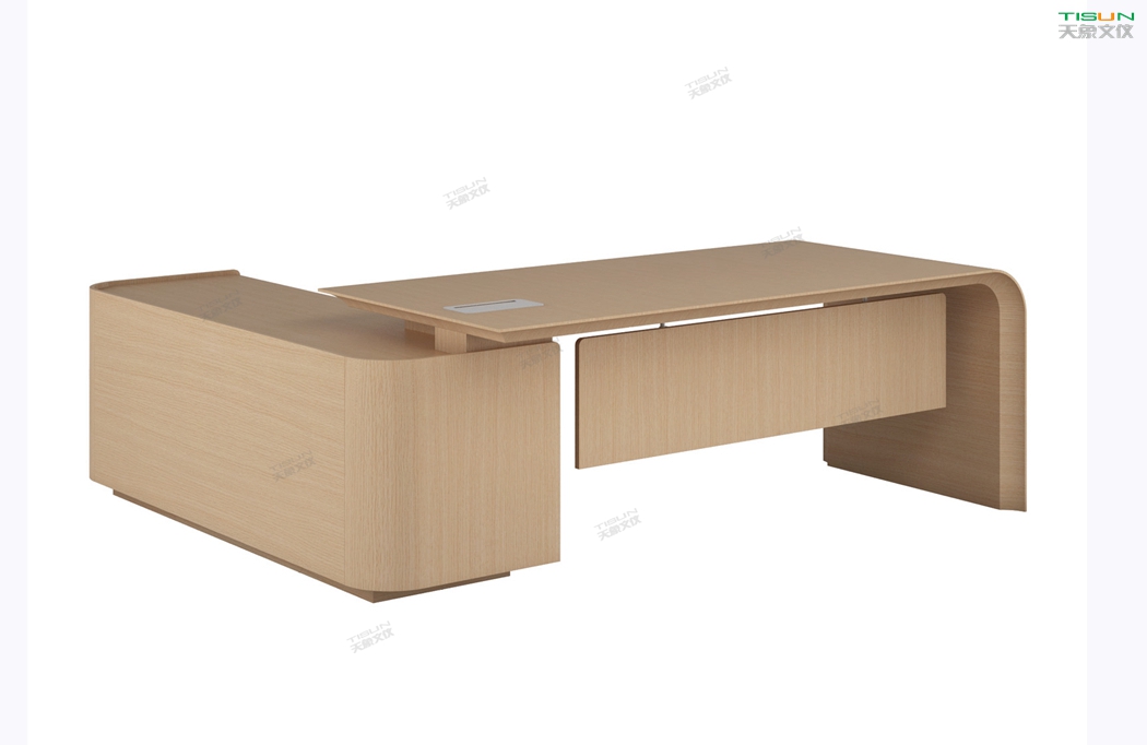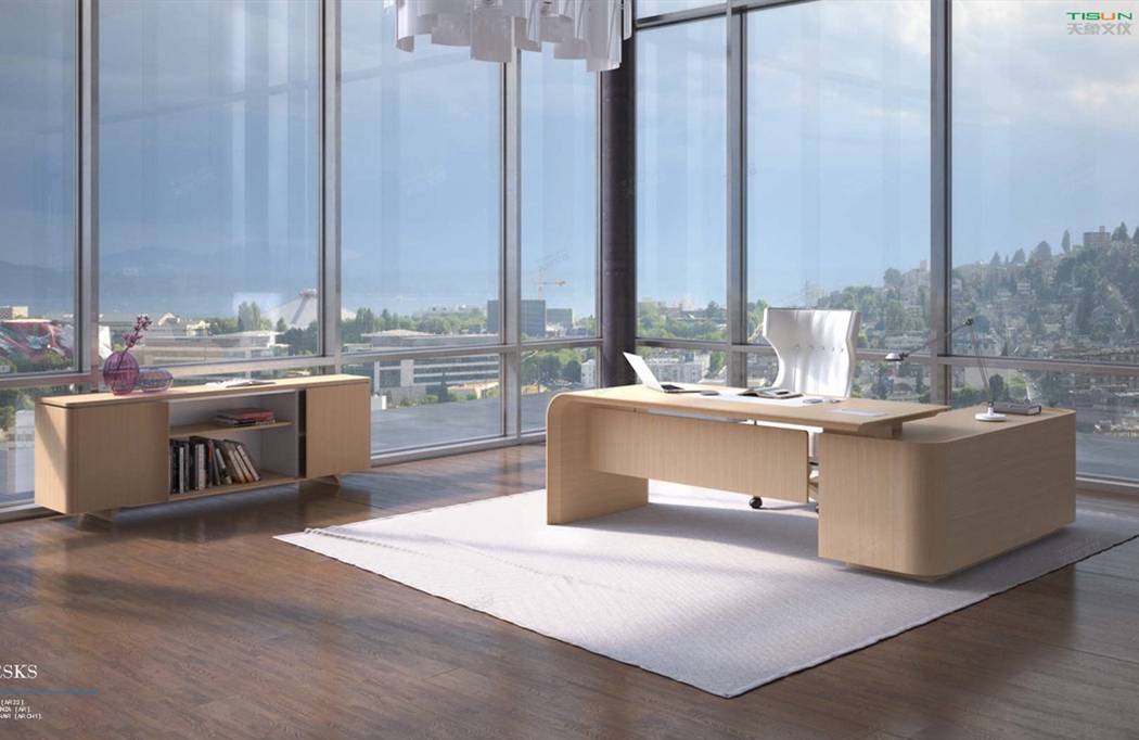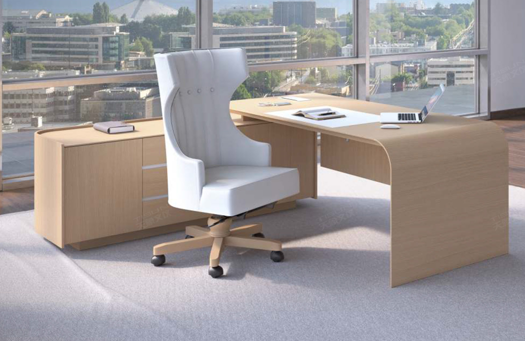 The office space has 2 floor to ceiling windows to meet the user's needs for illumination. This type of office furniture chooses light brown in color matching, and the turning lines are smooth. The class platform tripod and the overall customized office furniture adopt fashionable design and traditional technology. The large class platform series fully shows the taste and style of senior executives.