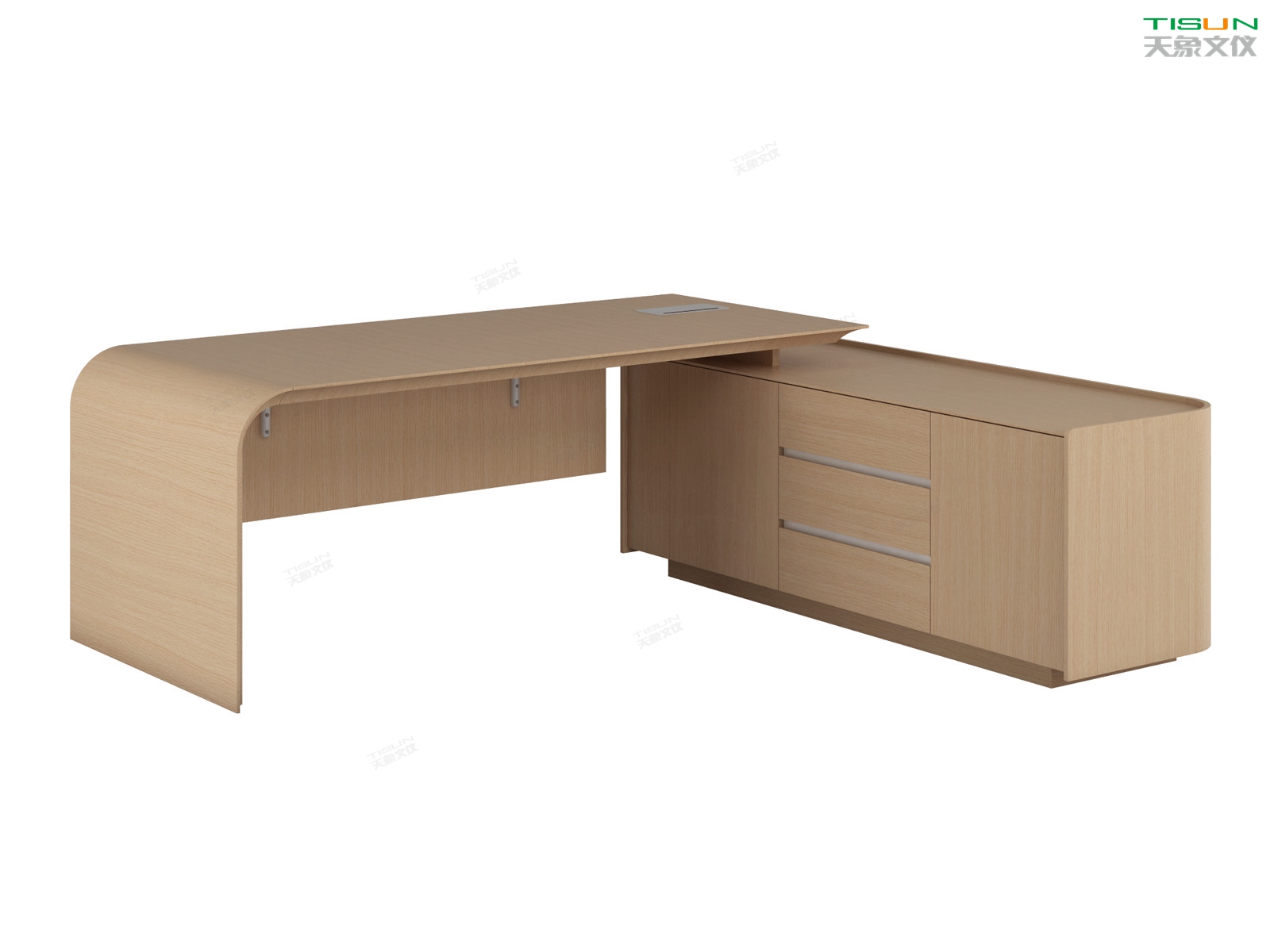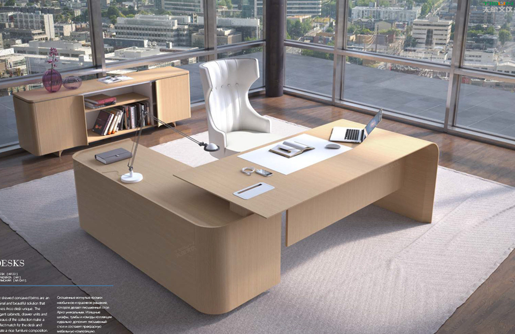 該辦公空間2面落地窗,為配合用戶對于光照度的需求。此款辦公家具在色彩搭配上選擇淺棕色,轉(zhuǎn)折線條流暢,班臺腳架及整體定制辦公家具采用了時尚設計及傳統(tǒng)工藝,大班臺系列充分揚顯了高級行政人員的品位和格調(diào)。